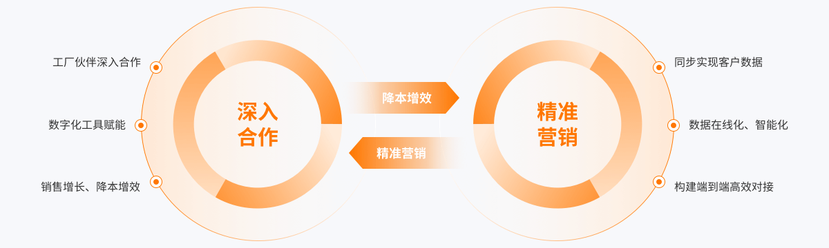一方面通過工廠合作伙伴的深入合作,數(shù)字化工具賦能幫助工廠實(shí)現(xiàn)銷售增長(zhǎng)、降本增效。另一方面,通過對(duì)于終端客戶的需求,實(shí)現(xiàn)精準(zhǔn)營(yíng)銷。同步實(shí)現(xiàn)客戶數(shù)據(jù)、產(chǎn)業(yè)鏈數(shù)據(jù)的在線化、智能化,構(gòu)建端到端的高效對(duì)接、實(shí)現(xiàn)合作共贏。