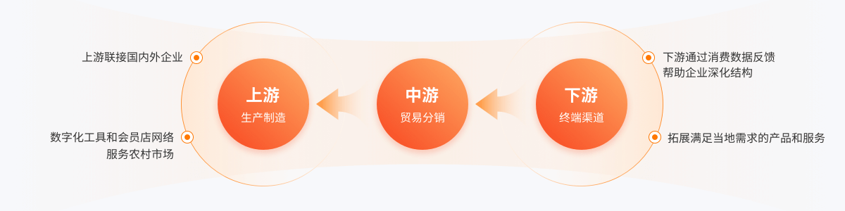 上游聯(lián)接國內(nèi)外企業(yè),通過數(shù)字化工具和龐大的會員店網(wǎng)絡(luò)服務(wù)農(nóng)村市場;下游通過消費(fèi)數(shù)據(jù)反饋幫助企業(yè)深化結(jié)構(gòu),拓展?jié)M足當(dāng)?shù)匦枨蟮漠a(chǎn)品和服務(wù)。最終實(shí)現(xiàn)產(chǎn)業(yè)鏈效率提升、戰(zhàn)略伙伴合作共贏。